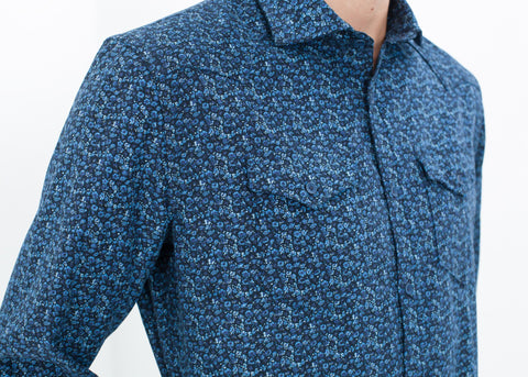 A Western style shirt gets a sweet touch with an all over floral motif. Two flap pockets at the chest and a classic western style yoke finishes the back. Aglini. Color Blue Floral. 100% Cotton. Made in Italy. Matt is wearing an Italian 42. Matt is 6’2”, Chest 38”, Waist 31”, Inseam 34.5”.